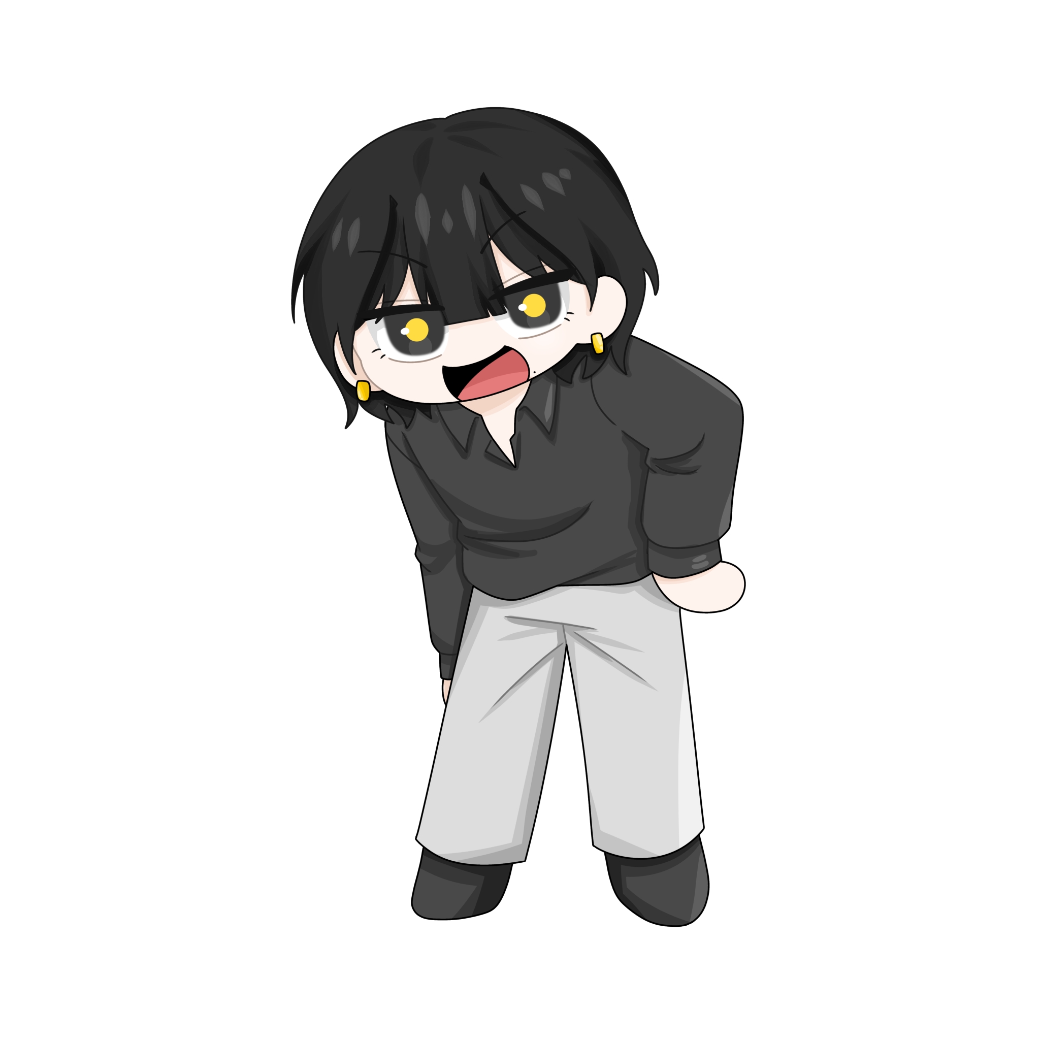 - 목 단추를 풀어헤친 검은색 셔츠.